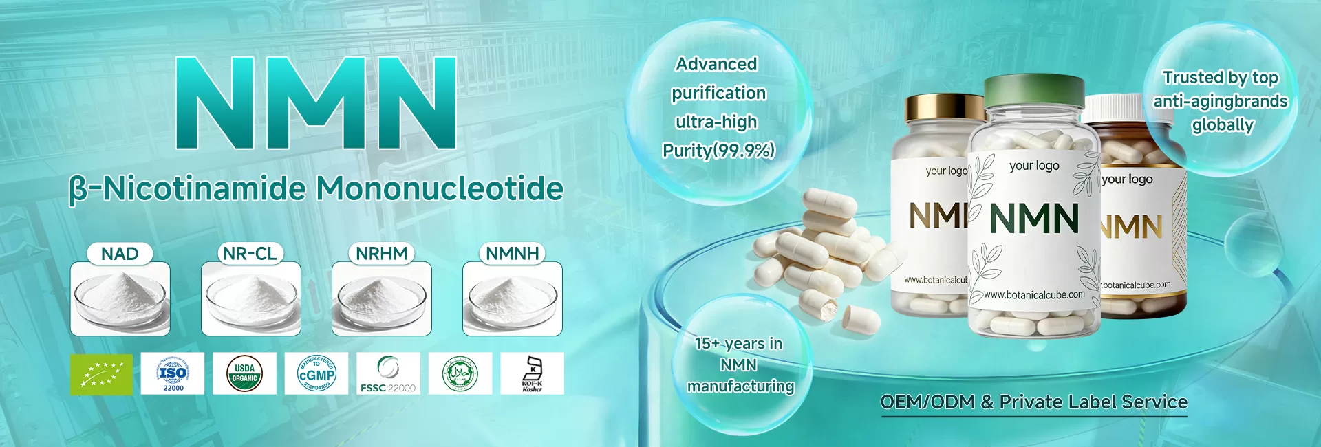 At Botanical Cube Inc., we produce high-purity NMN Powder with precise control over particle size and stability, ensuring consistent performance. Combined with our OEM capabilities, we provide partners with flexible formulation options, custom packaging, and scalable production. This approach ensures a reliable, high-quality NMN product tailored to brand-specific requirements.